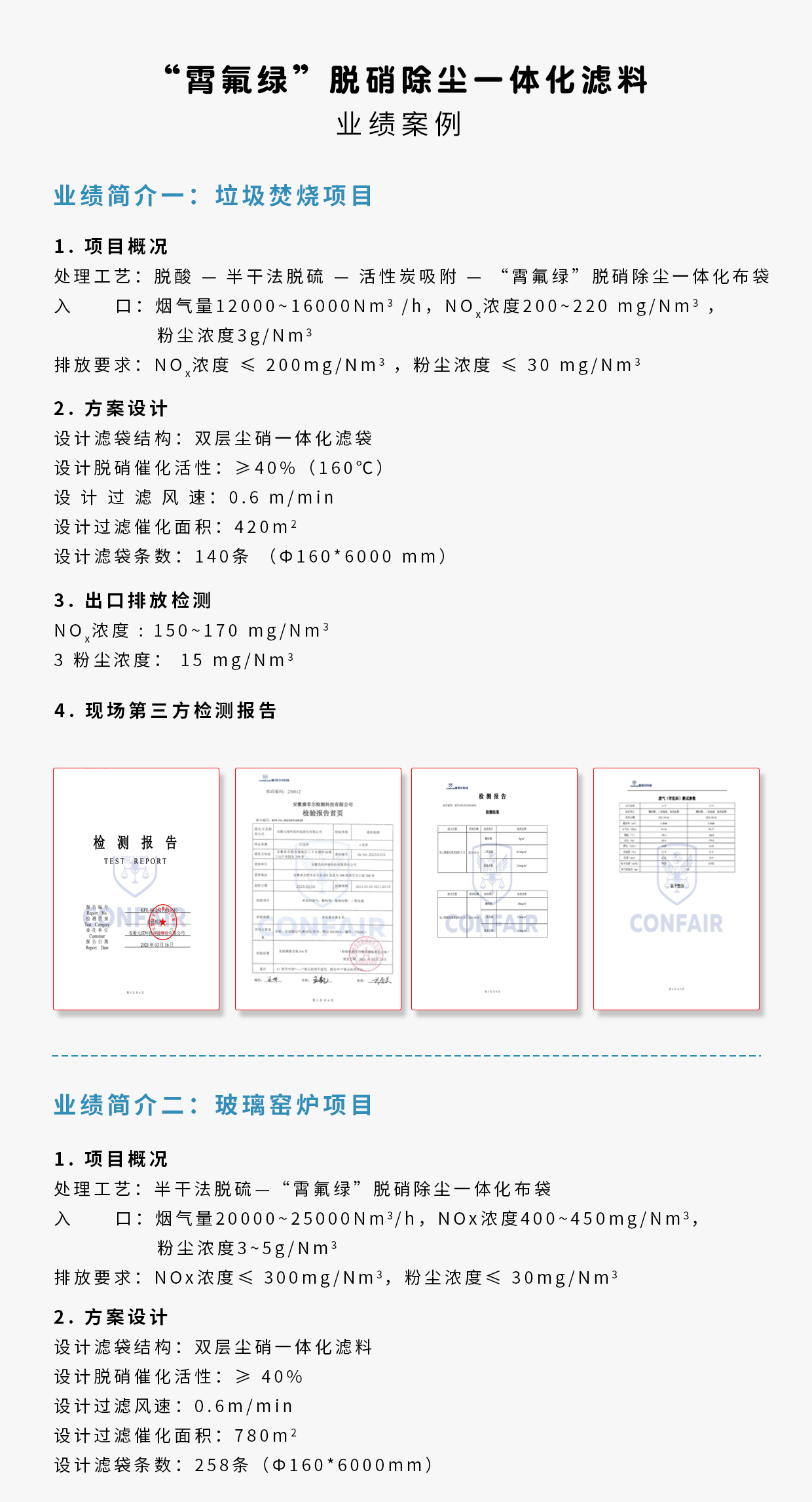 | 產(chǎn)品名稱 | 除塵脫硝一體化單層濾料 | 除塵脫硝一體化雙層濾料 | 除塵脫硝一體化覆膜濾料 | |